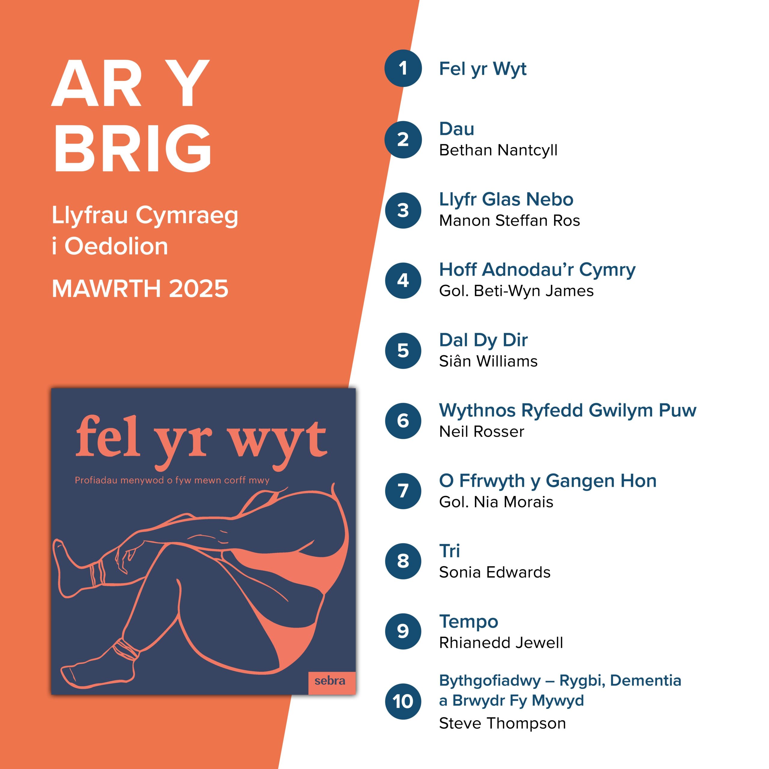 Dyma’r llyfrau sydd wedi bod yn hedfan oddi ar silffoedd ein Canolfan Ddosbarthu dros y misoedd diwethaf. Mae’r llyfrau ar gael i’w prynu yn eich siop lyfrau leol.