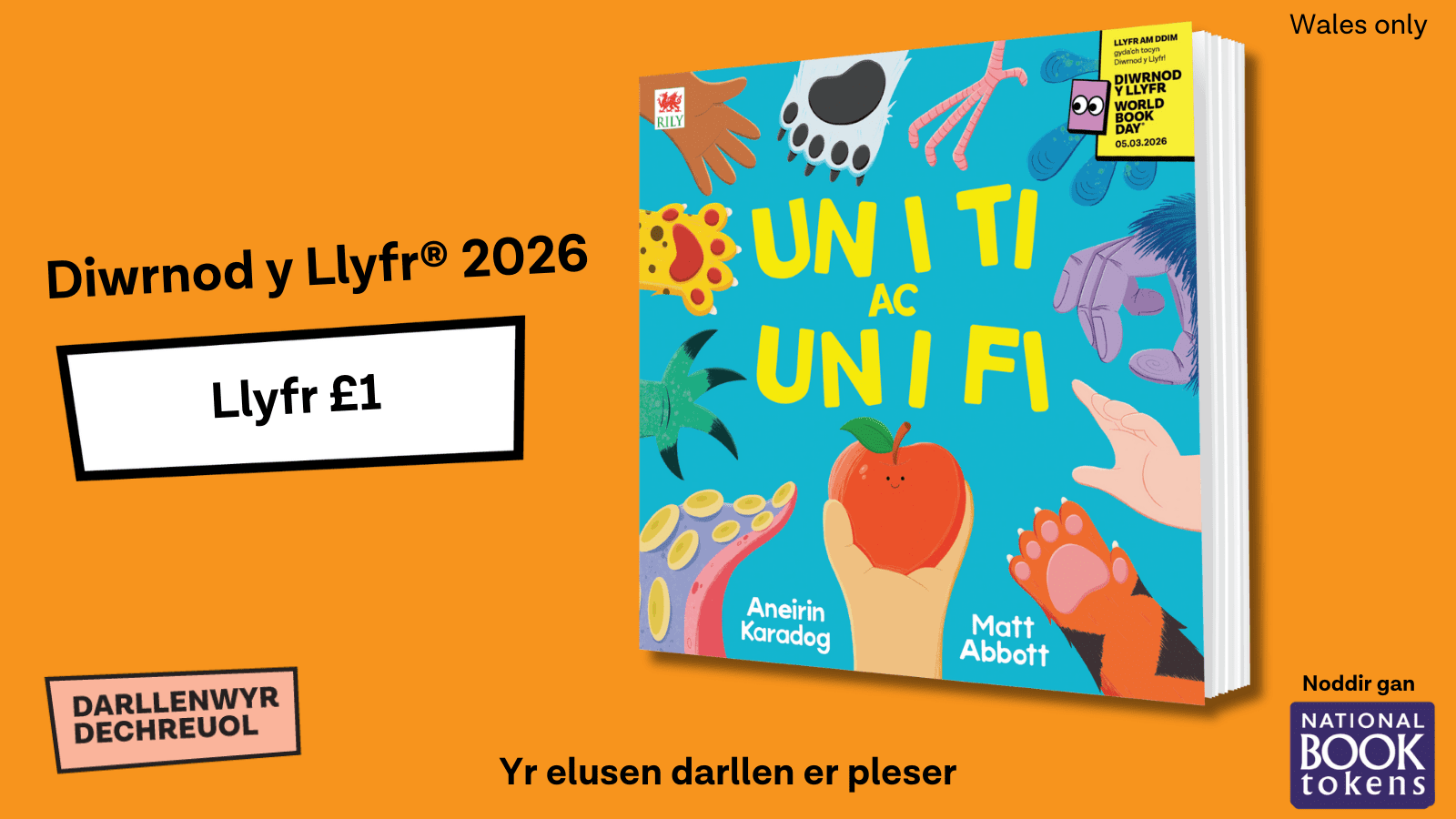 Un i Ti ac Un i Fi (RIly) gan Aneirin Karadog yw’r llyfr £1 Cymraeg newydd ar gyfer 2026 ac mae ar gael nawr drwy siopau llyfrau Cymru.